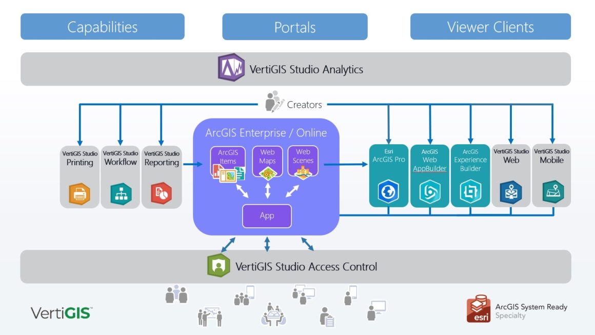 VertiGIS Studio ergänzt das ArcGIS System um vielfältige Funktionskomponenten. Dazu zählen der Workflow Manager für die Abbildung benutzergeführter Vorgänge, hochwertige Druckfunktionen, ein umfassendes Berichtswesen, grafische Dashboard-Anwendungen oder eine erweiterte Zugriffsberechtigung. VertiGIS Studio Access Control ermöglicht dabei die Umsetzung eines feingranularen Berechtigungskonzepts und die Definition von Schutzstufen für Daten und Services.