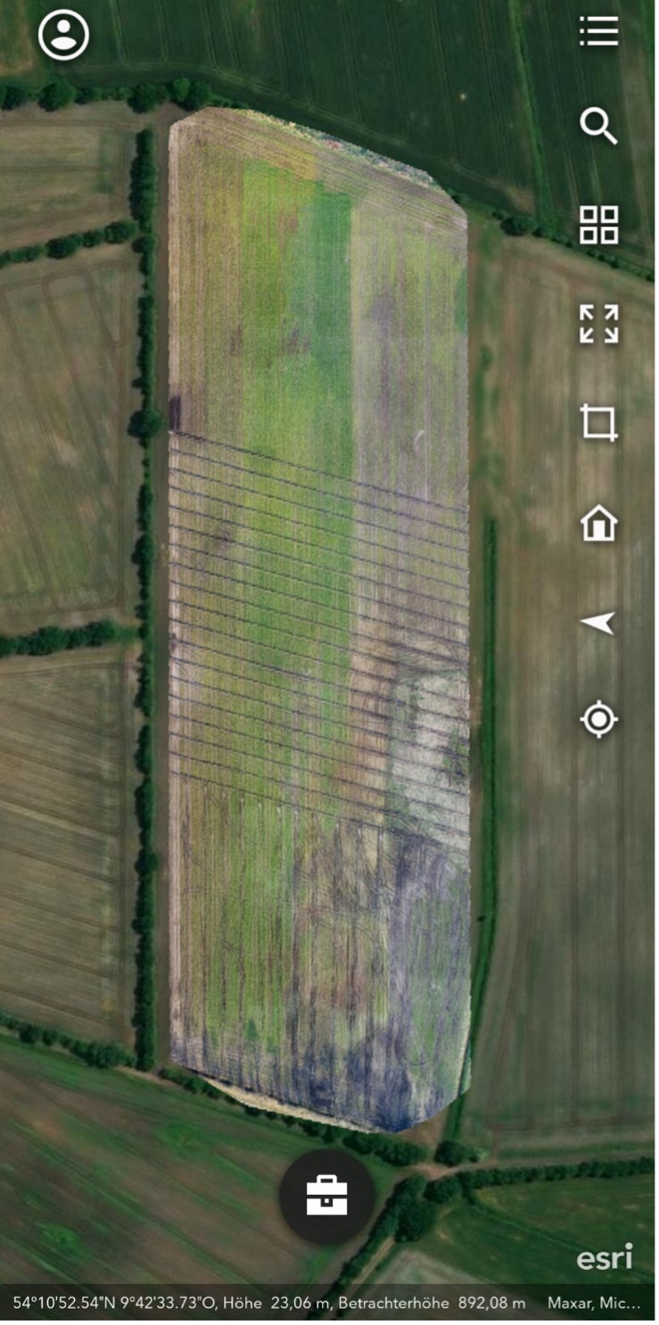 In Drone2Map oder SiteScan for ArcGIS verarbeitet, können diese Bilder nachfolgend in ArcGIS Earth auf dem Smartphone dargestellt werden. So kann der Landwirt über die Position seine Drainagen auffinden.