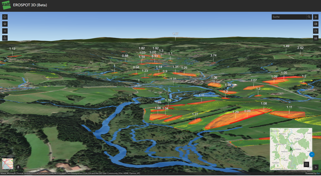 Daten bilden die Grundlage: Geländedaten, Klimadaten sowie Daten zur Landnutzung und Bewirtschaftung aus verschiedenen Quellen werden in einem Geoinformationssystem wie ArcGIS zusammengeführt und mithilfe von Algorithmen analysiert. Daraus hat das Projekt Risikokarten erstellt, die den Bodeneintrag in Gewässer wie Bäche, Flüsse und Seen, darstellen. Die Web-App des Forschungsprojekts EROSPOT ist für jeden zugänglich. Aktuell können Risikokarten von ausgewählten Einzugsgebieten in Bayern abgerufen werden, in den kommenden Monaten wird der Datenbestand jedoch schrittweise aktualisiert und erweitert. Die Karten zeigen die Erosionsgefährdung auf einer Skala von grün (niedriges Risiko) bis rot (hohes Risiko). Die besonders gefährdeten Bereiche werden zudem als Hotspots hervorgehoben. Zudem zeigt eine Gewässerkarte, wie die Ackerflächen an das Gewässernetz angebunden sind. Ganz entscheidend ist die Darstellung der Ergebnisse in 3D. So wird schnell klar, wohin Wasser und Boden bei starkem Regen fließen.