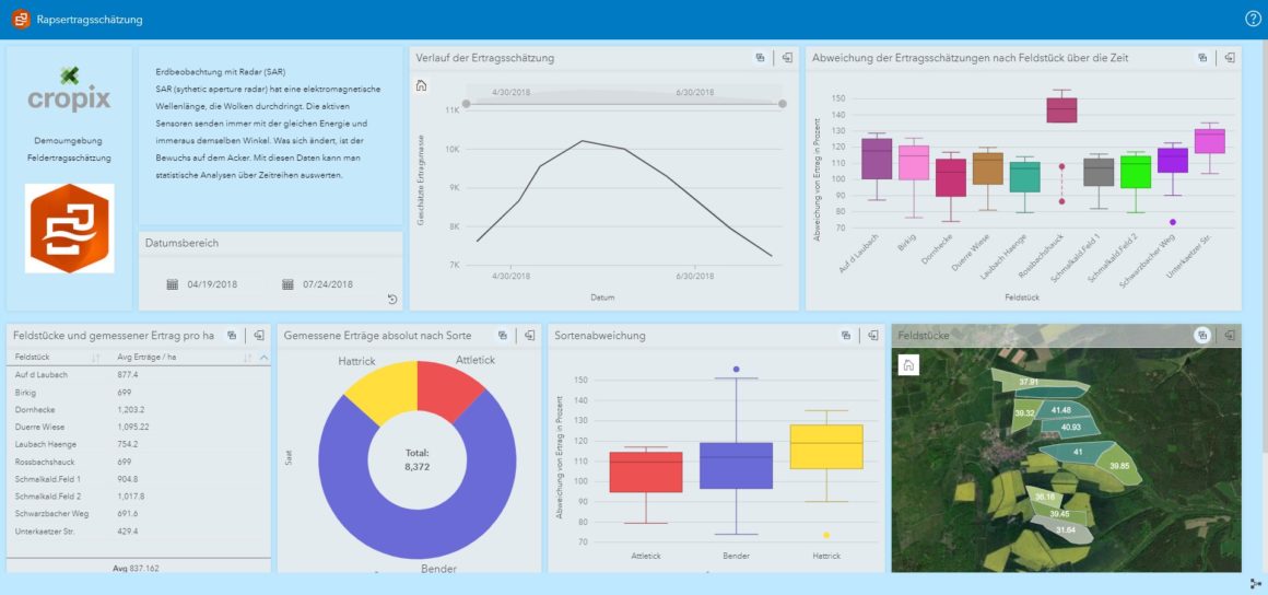 In ArcGIS Insights ist bereits ein Werkzeug integriert, das es dem Nutzer ermöglicht, solche Ertragsprognosen auf Basis des ESVI selbst zu erstellen. Mit diesem Werkzeug kann der Landwirt während der Saison die entsprechenden Auswertungen für seine Flächen durchführen und die Ergebnisse direkt visualisieren. So kann er auf einen Blick den Wachstumsverlauf aller Flächen analysieren.