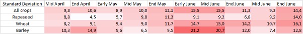 Mit der Standardabweichung kann man eine Aussage über die Güte der Prognose treffen. Es zeigt sich, dass eine Vorhersage in der ersten Mai-Hälfte in zwei von drei Jahren um weniger als zehn Prozent vom tatsächlich gemessenen Ertrag abweicht. Für den Zeitraum von 20 Jahren gilt, dass der vorhergesagte Ertrag vermutlich nur einmal um mehr als 20 Prozent vom tatsächlichen Ertrag abweicht.