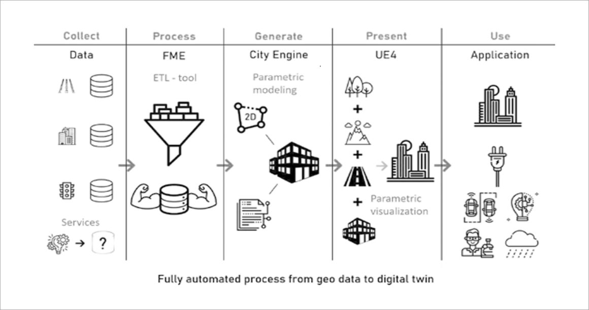 Nachdem diese Modelle generiert sind, werden sie in die Unreal Engine (UE4) von Epic Games importiert. UE4 bietet Möglichkeiten zum Hinzufügen von Kollisionsobjekten, verschiedenen Detaillierungsebenen (LODs, levels of detail) und weiteren Elementen – allesamt notwendig für das Zusammenfügen aller Objekte, damit die virtuelle Version einer Stadt in Echtzeit erstellt werden kann. Danach kann sie als Anwendung ausgeführt und auch um neue Datentypen erweitert werden.