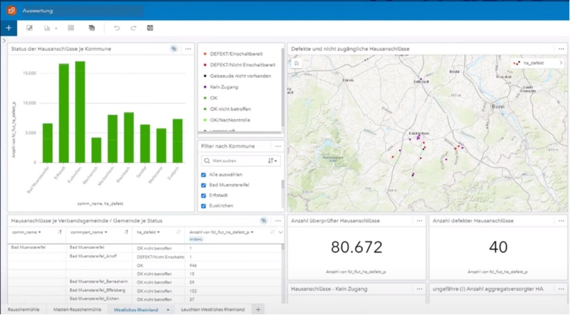 Die Erfassung wichtiger Informationen wie z.B. Aggregatstandorte, Status der Überprüfung und Wiederversorgung von Hausanschlüssen und vieles mehr war möglich. Die sich ständig ändernden Anforderungen vor Ort wurden in kurzen Sprintzyklen – anfangs täglich – umgesetzt. Wichtige Erfolgsfaktoren waren eine bereits vorhandene Esri Enterprise Umgebung, eigene Kapazitäten zur Anwendungsgestaltung und die Erfahrung sowohl der Entwickler*innen als auch der Nutzer*innen mit agilen Methoden.