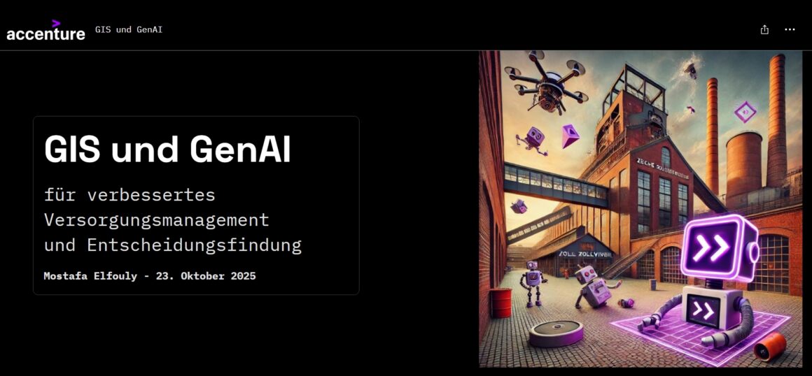 ME: Wir stehen an der Schwelle zu einer neuen Ära, in der GIS, Generative AI und Nachhaltigkeit untrennbar miteinander verbunden sind. Unsere Vision bei Accenture ist die einer autonomen GIS-Architektur, in der Generative AI nicht nur Daten analysiert, sondern aktiv Entscheidungen vorbereitet, Prozesse steuert und Workflows dynamisch optimiert.
