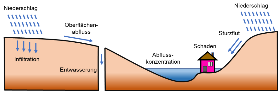Auf den Niederschlagsmengen baut die Modellierung des Wasserabflusses auf. Neben der Aufnahmekapazität der städtischen Entwässerung muss dabei berücksichtigt werden, dass nicht-versiegelte Flächen je nach ihrer Beschaffenheit ebenfalls Regenwasser aufnehmen. In vielen Städten kann es zudem zu Sturzfluten kommen, wenn Wasser an der Oberfläche zusammenströmt.